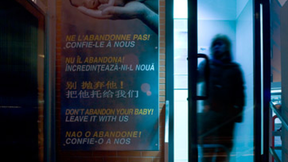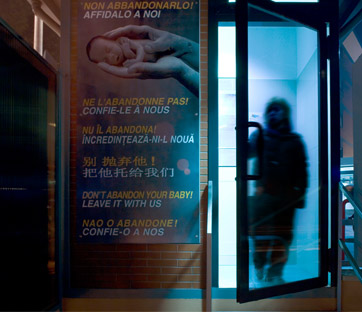 Roma, stazione ferroviaria Casilino - Pubblicità del servizio di accoglienza per neonati abbandonati attivo presso il Policlinico Casilino, versione moderna dell'antica "Ruota degli esposti". Foto: Massimo Siragusa/Contrasto