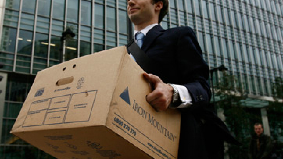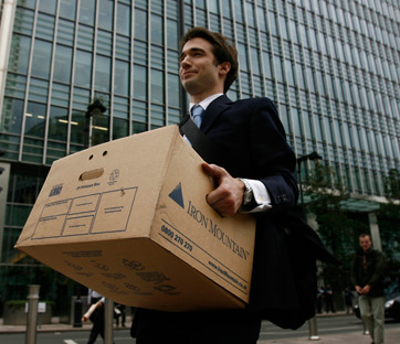 Londra. Un dipendente lascia gli uffici della banca di investimenti Lehman Brothers. Foto: Reuters/Andrew Winning/Files