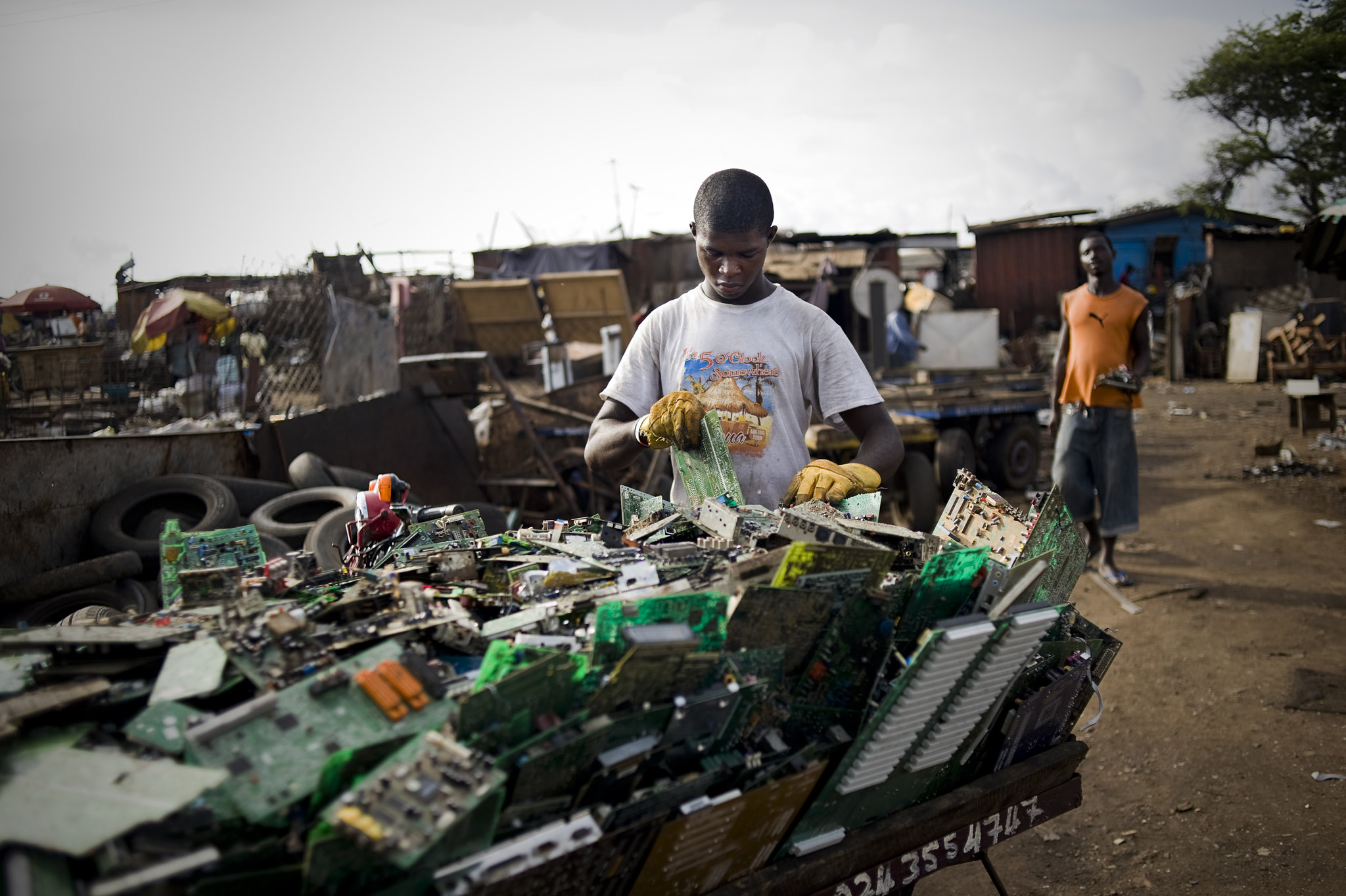 Uomo al lavoro in una discarica di rifiuti elettronici in Ghana. Foto: Kai Loeffelben/Flickr