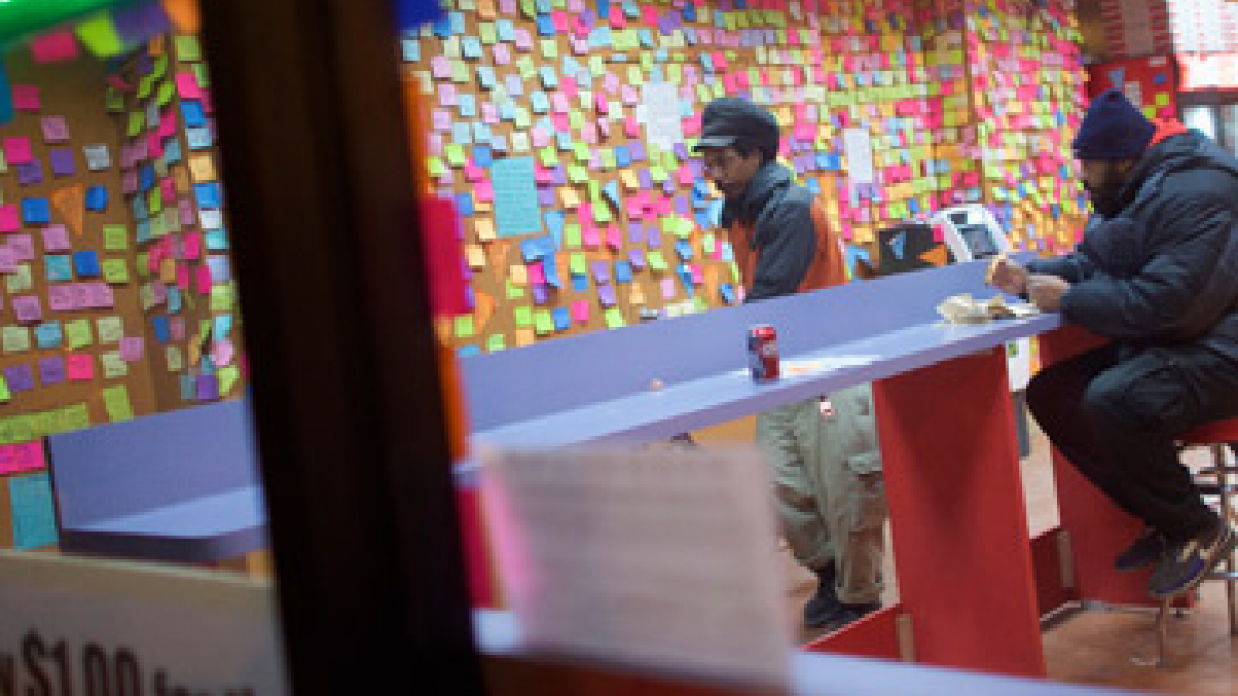 Philadephia, gennaio 2015. Un dipendente di Rosa's Fresh Pizza porta fuori la sua bicicletta per andare a fare una consegna. Il proprietario, Mason Wartman, ex operatore finanziario a Wall Street, nel 2013 ha aperto la sua pizzeria, dove vende pizze a 1