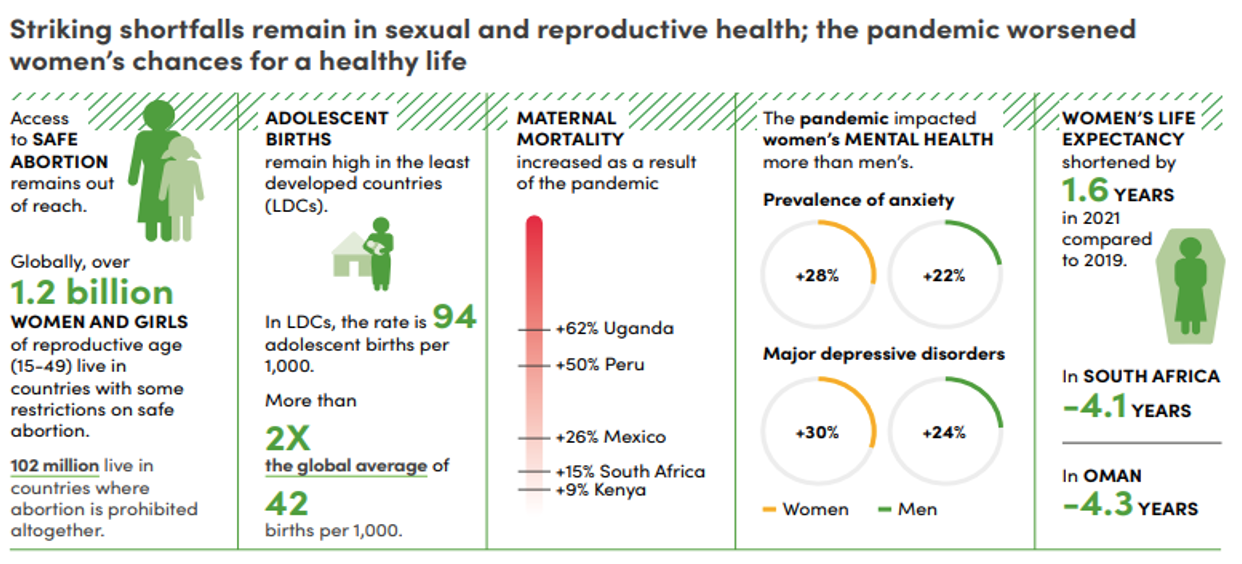 Il terzo obiettivo di sviluppo sostenibile riguarda la “salute e il benessere”. Anche in questo caso la pandemia ha impattato in modo grave, lasciando le donne più povere senza cure, compresa l’assistenza nella salute sessuale e riproduttiva. Sono oltre 1,2 miliardi le donne e ragazze tra i 15 e i 49 anni che vivono in Paesi con restrizioni all’accesso all’aborto sicuro e 102 milioni risiedono in Paesi in cui è del tutto proibito.