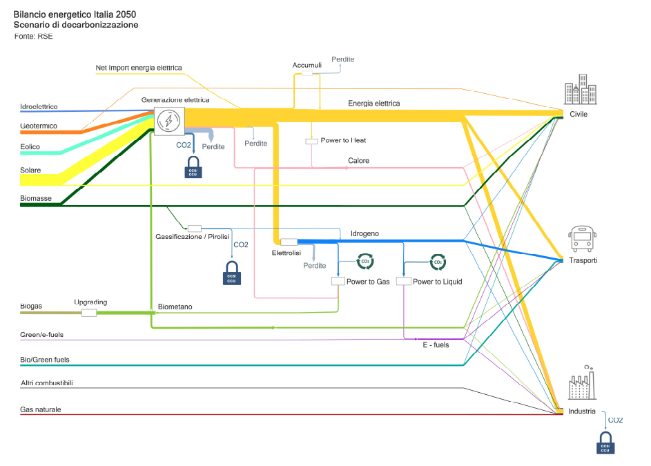 C’è poi il tema dello stoccaggio della CO2. I modelli infatti hanno mostrato che, fermo restando l’aumento del fotovoltaico e dell’eolico, dell’utilizzo dei biocombustibili, molto probabilmente saremo costretti a ricorrere a tecnologie di cattura della CO2, più specificatamente detto CCS. La CCS è la cattura e stoccaggio di carbonio, e, detta in modo semplice, è quel processo di cattura della CO2 che viene iniettata sotto terra. Secondo la Strategia, nei settori dell’acciaio e del cemento si potrebbe arrivare a “catturare” 10-20 milioni di tonnellate di CO2 equivalente.