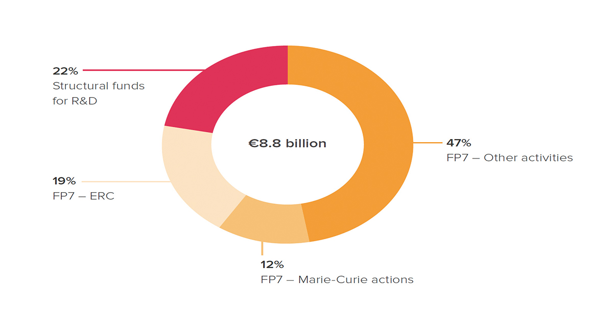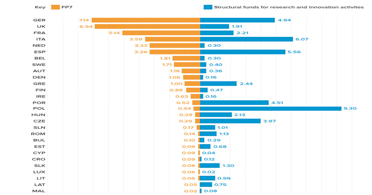 Distribution of EU expenditure on Research, Development and innovation in EU-28 countries. 2007 – 2013 (€ billion).SOURCES: ROYAL SOCIETY
