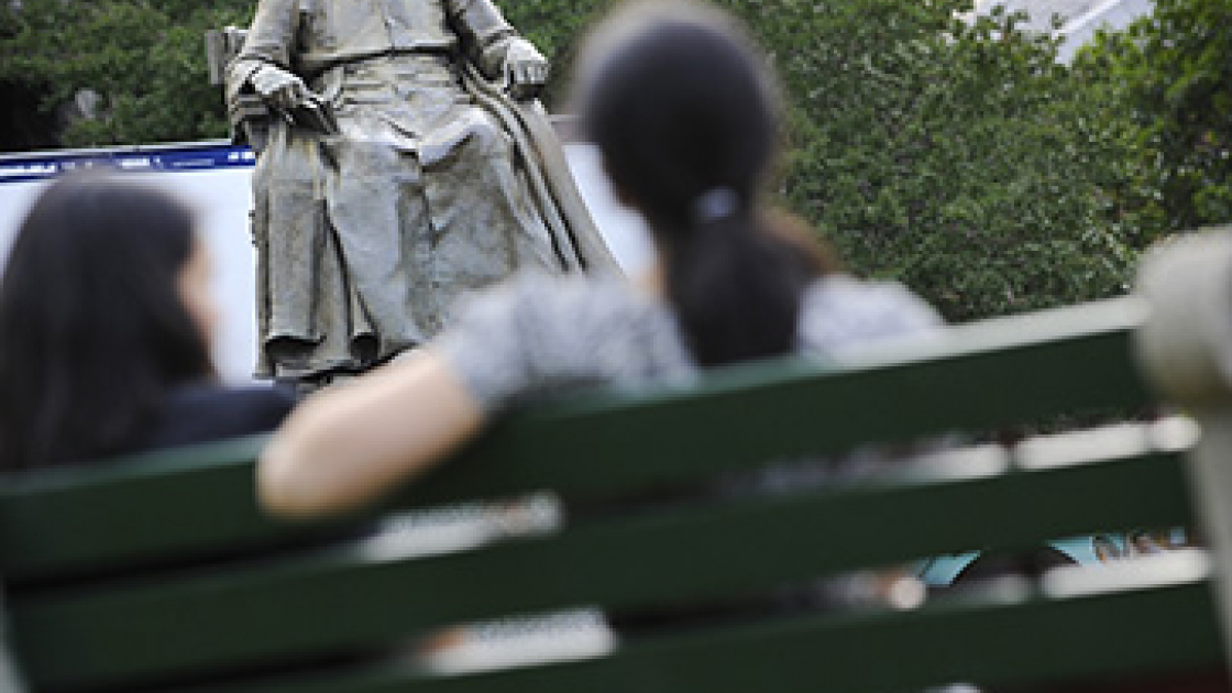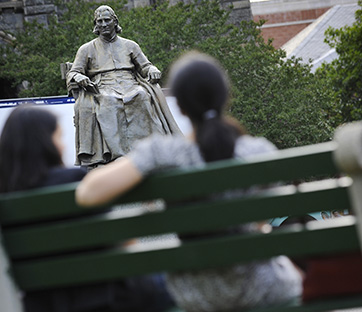 La statua di John Carroll, primo arcivescovo di Baltimora e fondatore dell'università di Georgetown, posizionata all'interno del campus di Washington. Foto: Reuters/Jonathan Ernst