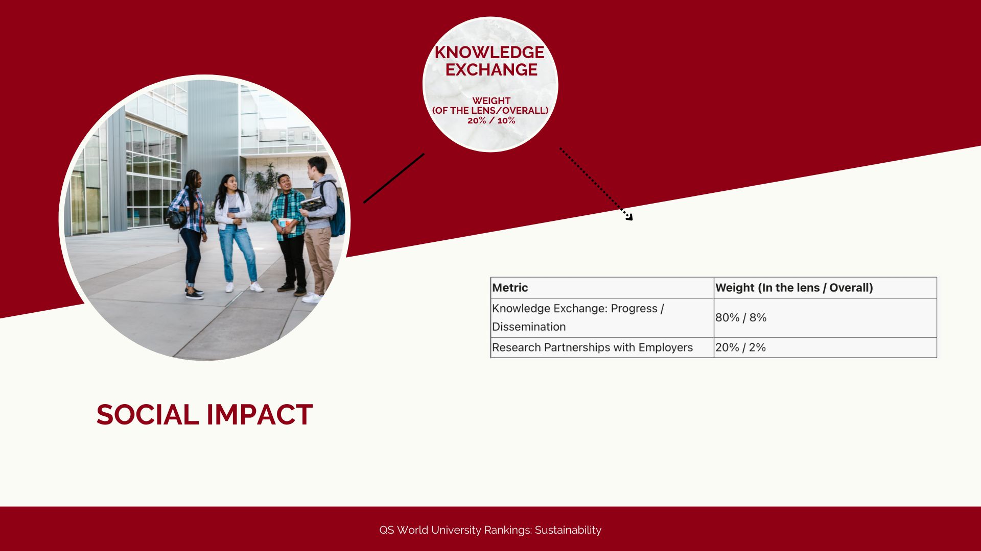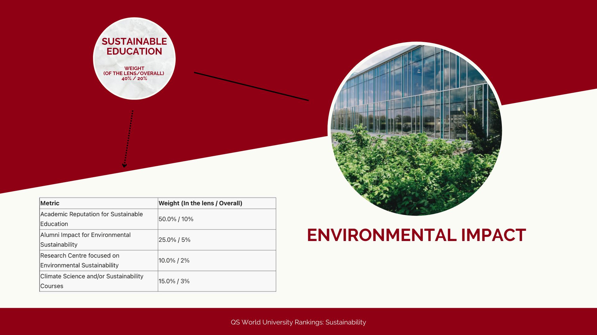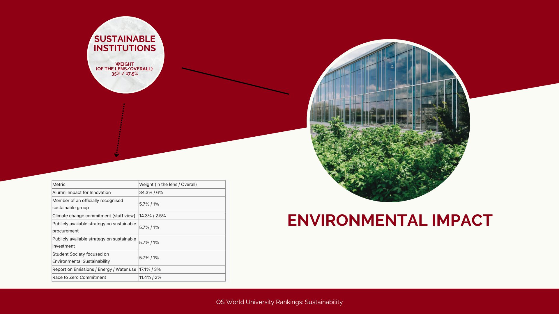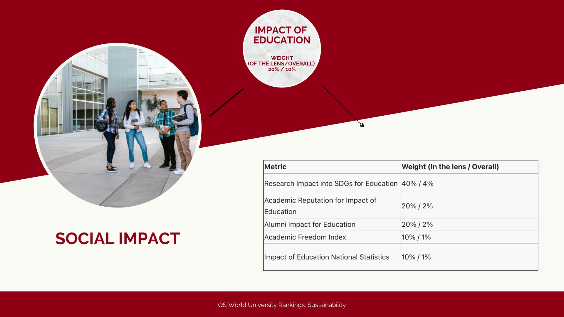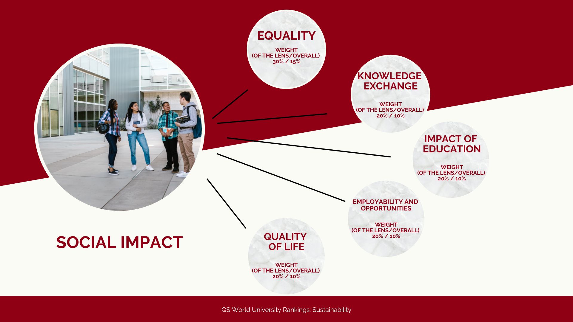 Ognuno di questi sotto indicatori ha un peso diverso nella valutazione della QS World University Rankings: Sustainability. In totale sono 23 i sotto indicatori che valutano l’impatto sociale degli atenei, nove in più rispetto a quelli riferiti all’impatto ambientale. Questa seconda macro-categoria vede al suo interno una divisione per: sostenibilità delle istituzioni, sostenibilità nella formazione e sostenibilità nella ricerca. Anche in questo caso quindi, i sotto indicatori sono diversi e vanno dall’impegno per l’innovazione ai vari report sul consumo di energia, acqua e sulla chiarezza delle proprie emissioni.
