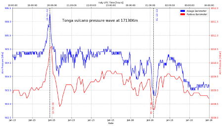 Il vulcano sottomarino Hunga-Tonga-Hunga-Ha'apa è esploso al mattino del 15 gennaio scorso in mezzo all’Oceano Pacifico alle ore 04:14:45 UTC, liberando un’energia pari a 1.000 bombe atomiche di Hiroshima (Sydney Morning Herald). Questa energia si è dispersa nell’ambiente, creando tsunami fino a oltre 10.000 km di distanza (link), innalzando le nubi vulcaniche fino a 30 Km di altezza (Ozone Mapping and Profiler Suite (OMPS) dati NASA) e facendo espandere la nube per 260 km, tanto da essere chiaramente visibile dai satelliti geostazionari. La violenta esplosione ha creato un’onda di pressione supersonica che ha cominciato a propagarsi in tutte le direzioni (video1 video2), ad una velocità di 340 m/sec, pari a circa 1.200 km/h. A 2.000 Km di distanza è stata sentita nettamente la deflagrazione, qui cosa è stato sentito a circa 750 km di distanza (audio/video).