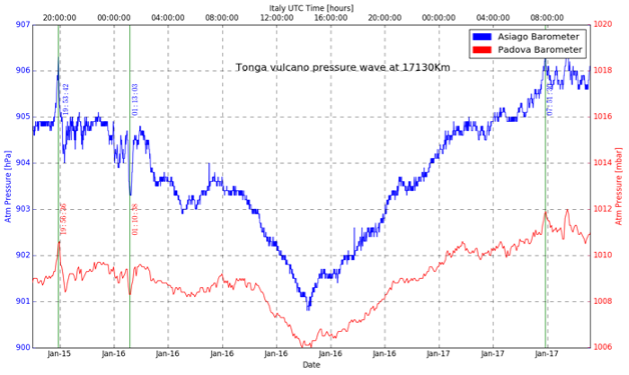 Nel grafico delle variazioni barometriche registrate dalle centraline meteo del nostro Dipartimento, si nota che la prima onda di pressione è arrivata prima ad Asiago alle 19:53:42 UTC (15h 38m dopo l’esplosione) e dopo a Padova alle 19:56:36 UTC (15h 41m dopo l’esplosione), gli orologi sono sincronizzati allo stesso server di tempo. La seconda onda, quella proveniente da sud, è arrivata prima a Padova alle 1:10:38 (20h 55m dopo l’esplosione) e dopo ad Asiago alle 1:13:03 (20h 58m dopo l’esplosione).