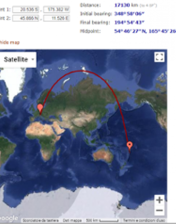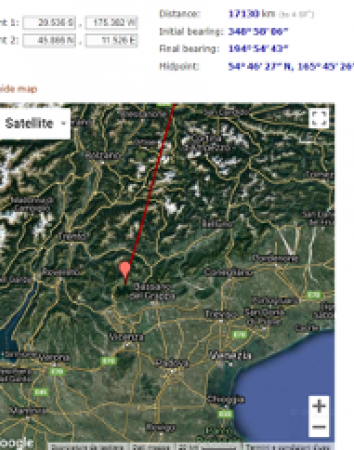 Il vulcano si trovava a queste coordinate 20.536°S 175.382°W, mentre le stazioni meteorologiche del dipartimento di Fisica e Astronomia sono collocate a Padova (45.402°N 11.868°E) e all’Osservatorio Astrofisico di Asiago (45.866°N 11.526°E, 1004 m s.l.m.). Per posizione i nostri barometri sono quasi agli antipodi del vulcano, quindi hanno ricevuto l’onda di pressione due volte, quella proveniente dal lato nord e dal lato sud del vulcano. Nell’immagine è riportata la direzione di propagazione della congiungente più corta (proiezione di Mercatore), quella proveniente da nord del vulcano, che passa quasi dal polo nord, quindi arriva ai nostri rivelatori prima ad Asiago e poi a Padova. A velocità sonica di 1200 Km/h la distanza di circa 17.130 km dovrebbe essere percorsa in circa 14h, arrivando dalle nostre parti più o meno verso le 18:30 UTC, salvo considerare variazioni della velocità lungo il percorso. La direzione di arrivo è indicata dall’ingrandimento su Asiago; l’onda a questa distanza giunge quasi su un fronte piano, per l’onda la distanza Asiago-Padova è di circa 44 Km.