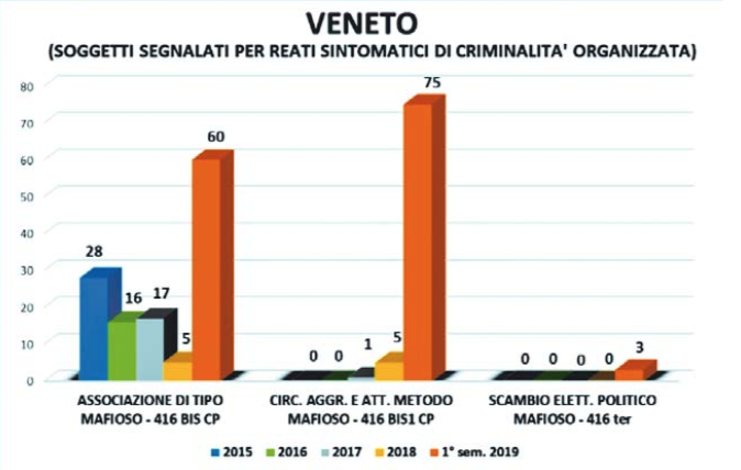“Esistono da tempo - riporta la relazione del ministero dell’Interno - forti segnali che indicano come il territorio del Veneto stia diventando di particolare interesse per le consorterie mafiose, attraverso presenza qualificate o vere e proprie proiezioni nel territorio regionale”.