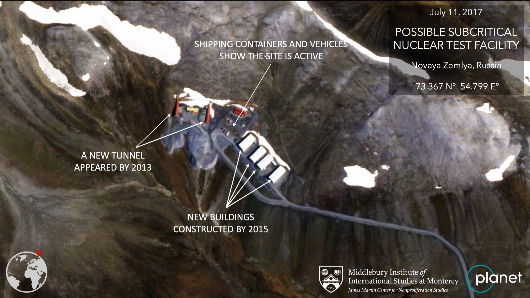 Foto aerea delle strutture del sito russo per test nucleari nell’isola di Novaya Zemlya (fonte Middlebury Institute of International Studies at Monterey)